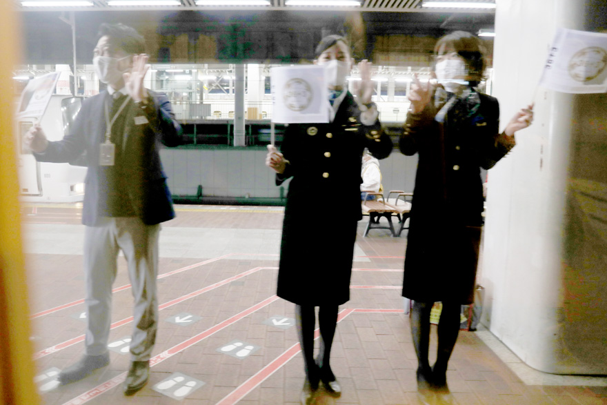 〔 博多駅 「36ぷらす3」佐世保行き ホームからJR九州社員の心のこもったお見送り! R 4. 11. 21 撮影 〕