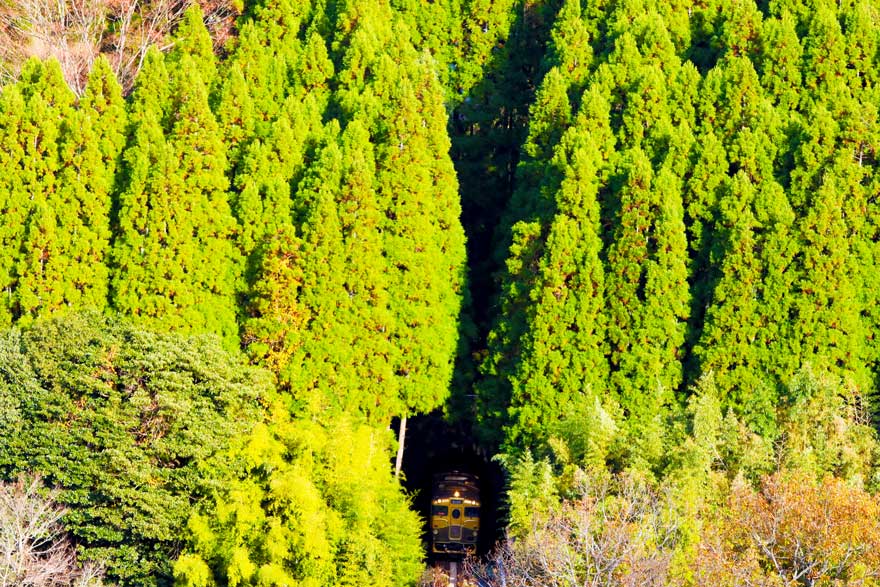 〔 或る列車(久大本線)引治~豊後中村 鬱蒼とした森の中から現れた! 「或る列車」 R. 4. 12. 2 撮影 〕