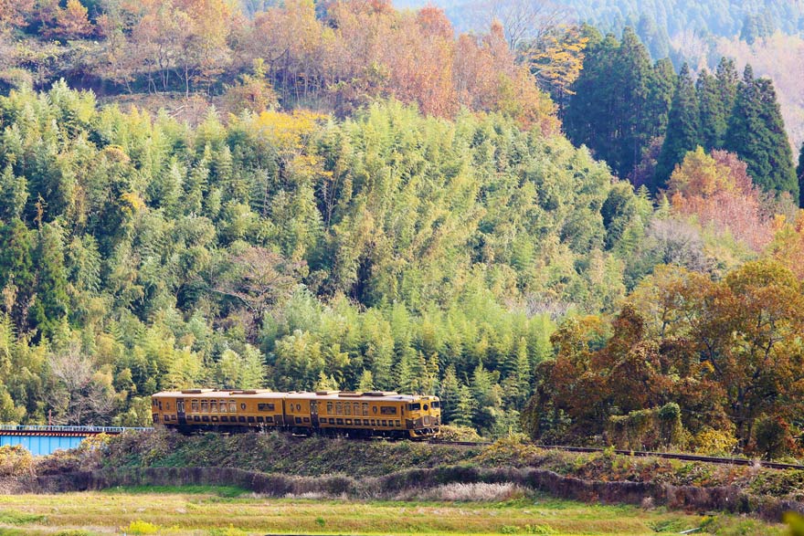 〔 或る列車(久大本線)引治~豊後中村 紅葉した木々を背景に鳴子川橋梁を渡り博多へ向かう!  R. 4. 11. 20 撮影 〕