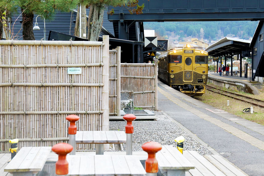 〔 久大本線 由布院駅 1番のりばホーム端にある「足湯」を眺めて発車を待つ!「或る列車」 R. 4. 12. 3 撮影 〕