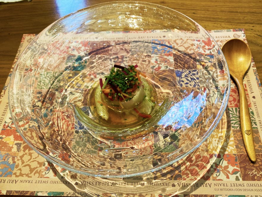 〔 或る列車 (お魚料理) ” 長崎県産クエのシャブシャブ、白菜とカラフルな根菜のスープ仕立て ” 〕