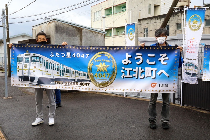 〔 ふたつ星4047 江北駅での歓迎! 西九州新幹線開業にあわせて肥前山口駅から改称! R.4. 11. 23 撮影 〕