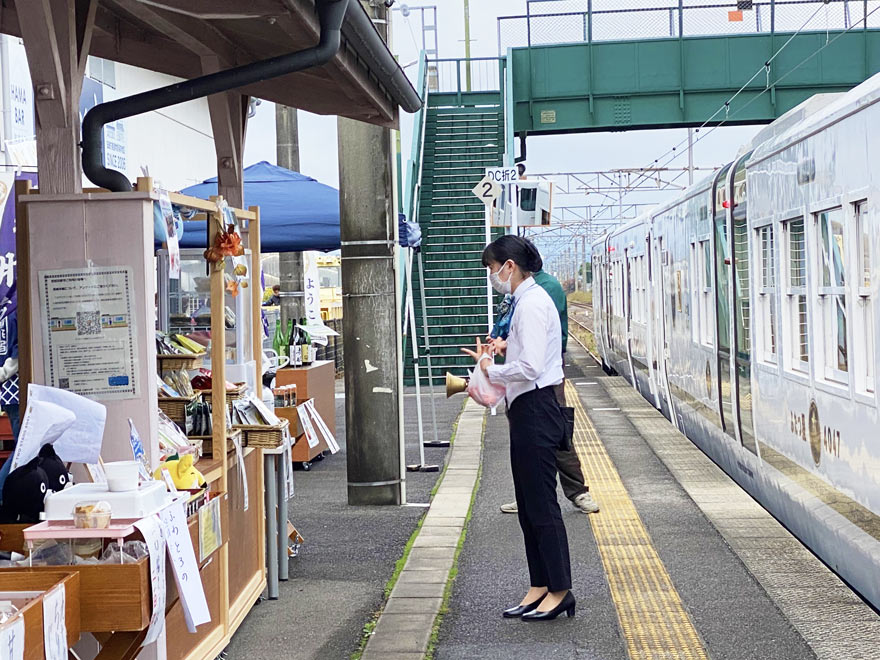 〔 ふたつ星4047 肥前浜駅 発車を知らせる ”鐘” を片手に客室乗務員! R.4. 11. 23 撮影 〕