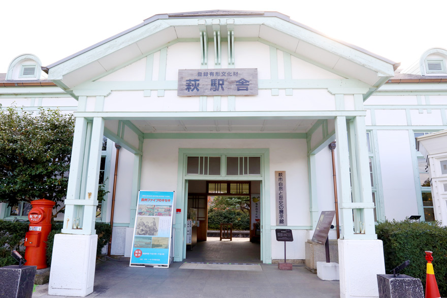 〔 萩 駅 美しく落ち着いた雰囲気で、瓦葺の屋根、白い壁、木製の窓枠など、どこか懐かしい雰囲気を感じさせます。〕