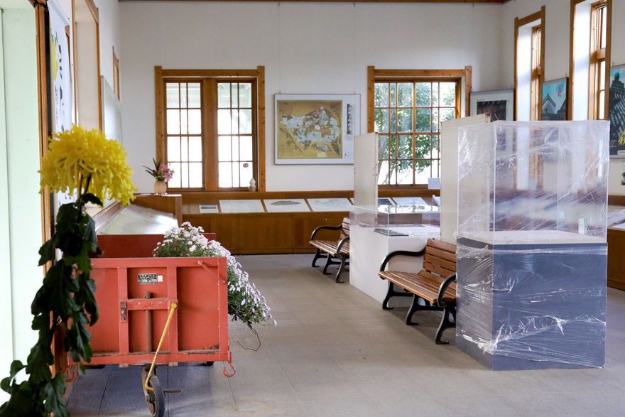〔 「萩市自然と歴史の展示館」 木製の椅子に座りながらゆっくりと展示物を拝見! R. 7. 11. 24 撮影 〕