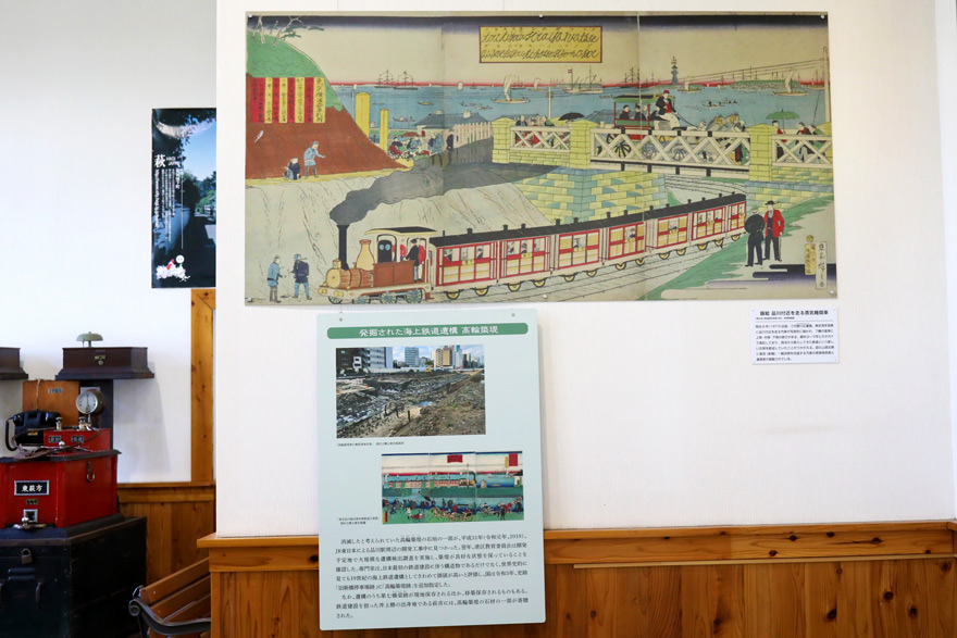 〔 萩 駅 「萩市自然と歴史の展示館」 錦絵「品川付近を走る蒸気機関車」と 鉄道開業時の高輪築堤の石材! 〕