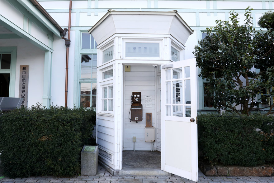 〔 萩 駅 駅舎入り口前には、大正末期から昭和初期に建てられた屋根は六角形で白塗りの電話ボックスを復元! 〕