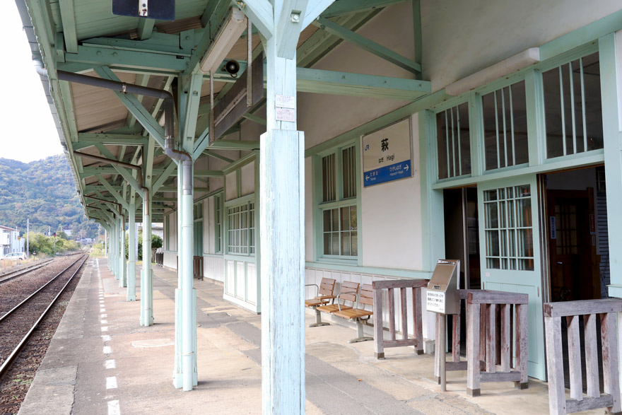 〔 山陰本線 萩 駅 無人駅で集札箱が設置されている簡素な改札口。(上りホームから望む) R. 7. 11. 24 撮影 〕