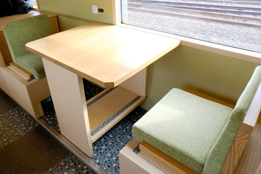 〔「〇〇のはなし」1号車(和風車両) 山側の席、2人がけのボックス席のみで2人だけで景色を堪能したい方にお薦め!〕