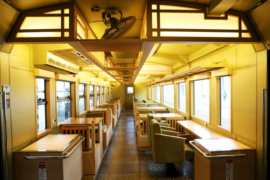 〔「〇〇のはなし」 1号車(和風車両) 天井には、電球色の照明を採用され、扇風機も上手に収まっている! 〕