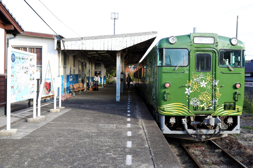 〔 観光列車「〇〇のはなし」 復路 (東萩発 新下関行き) 仙崎駅に到着!(34分間停車) R.7. 11. 24 撮影 〕