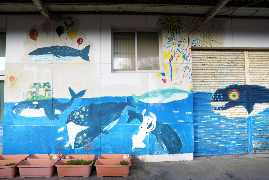 〔 仙崎駅 外壁には長門市在住のイラストレーター尾崎眞吾による鯨の絵が描かれている!  R. 7. 11. 24 撮影 〕