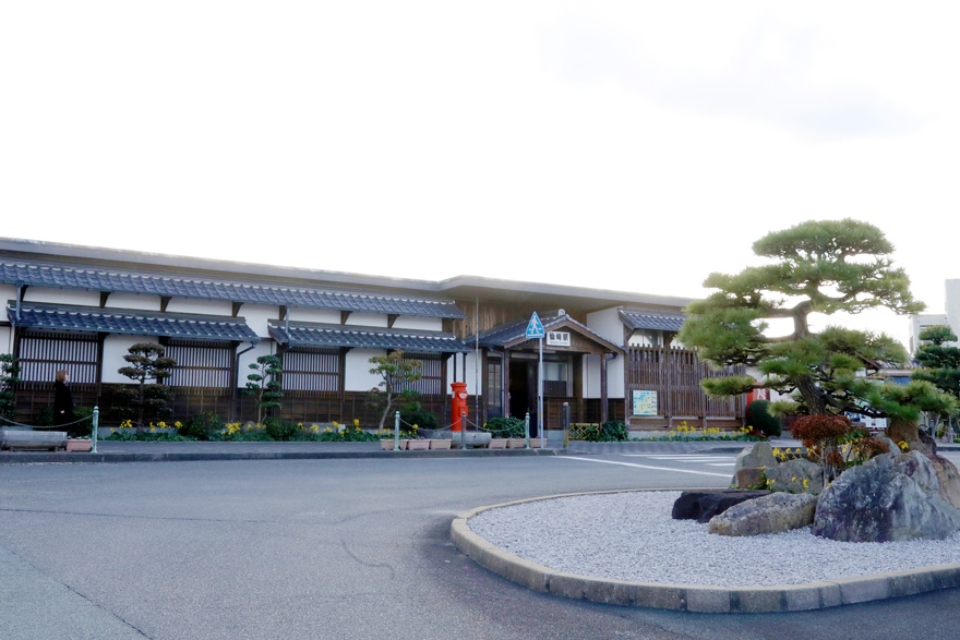 〔 仙崎駅 駅舎は鉄筋コンクリート造であるが、周囲を焼杉風の化粧壁と瓦葺きの飾り屋根で覆い、木造風の外観! 〕