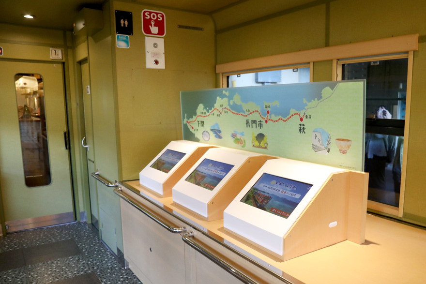 〔「〇〇のはなし」1号車(和風車両) 連結付近には、下関市・長門市 ・萩市のそれぞれの観光案内用モニター!〕
