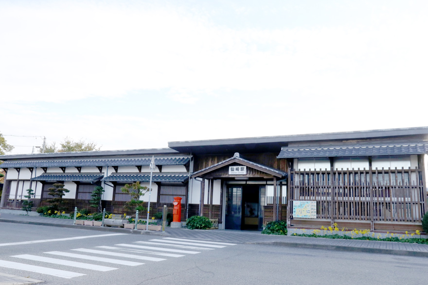 〔 仙崎駅 駅舎は鉄筋コンクリート造であるが、周囲を焼杉風の化粧壁と瓦葺きの飾り屋根で覆い、木造風の外観! 〕
