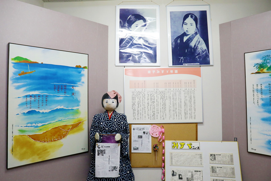 〔 仙崎駅 かつて駅事務室と手荷物取扱所であったスペースには、仙崎出身の童謡詩人「金子みすゞ」 の資料を展示! 〕