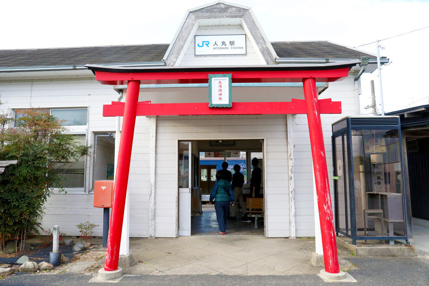 〔 山陰本線 人丸駅 駅の出入口に、近くにある ”元乃隅神社” をイメージした鳥居の設置された駅! 〕