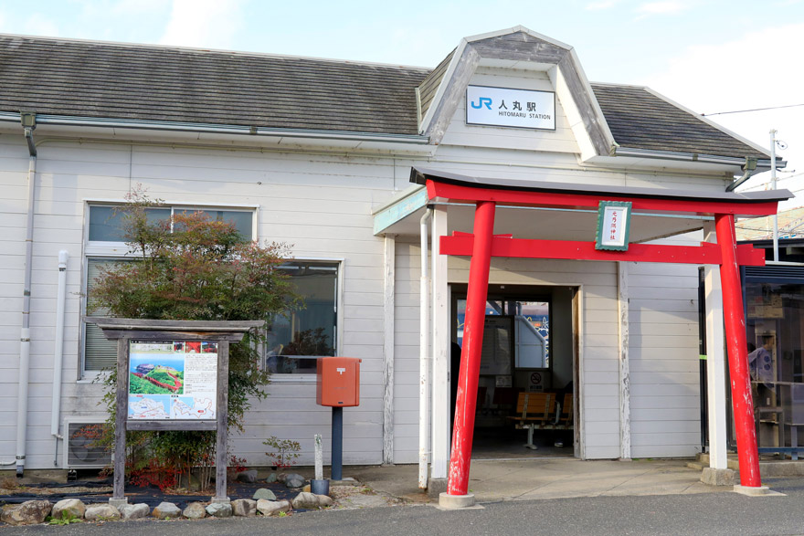 〔 山陰本線 人丸駅 国鉄時代から残る木造建築の建物で、駅の出入口に ”元乃隅神社” をイメージした鳥居が設置! 〕