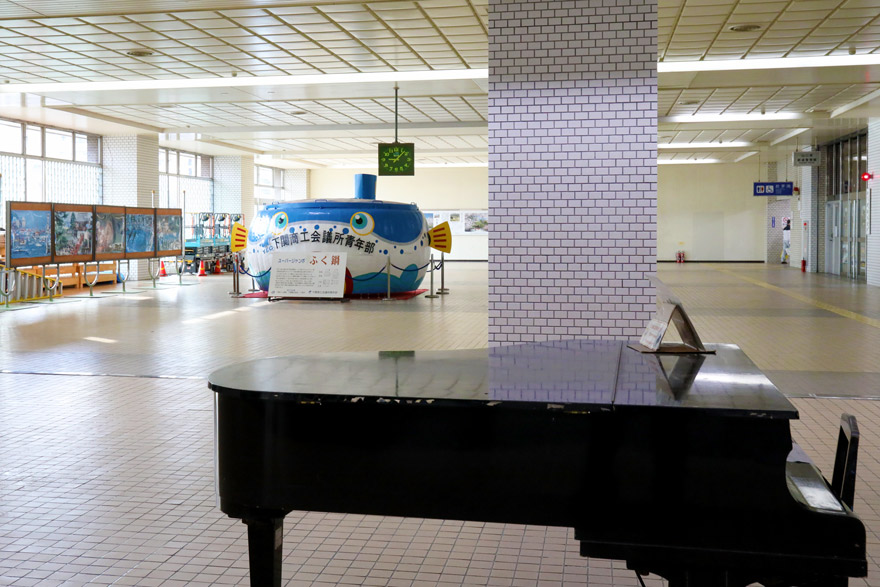 〔 新下関駅 構内に設置されている「巨大ふく鍋」 隣には「ストリートピアノ」が! R. 7. 11. 24 撮影 〕