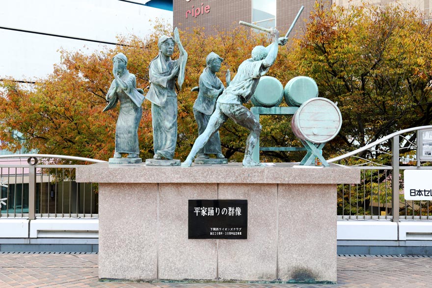 〔 JR下関駅 駅前の陸橋の上に、下関で有名な夏祭りで踊られる「平家踊り」をモチーフにした像があります! 〕