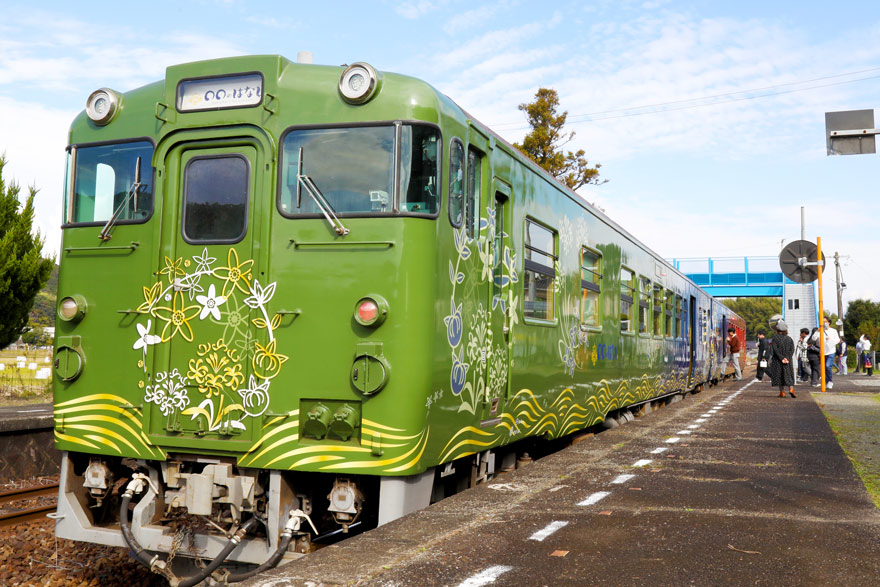 〔 観光列車「〇〇のはなし」 阿川駅で東萩行き 14分間停車! 外装は、夏みかんの花、ハマユウをあしらっている! 〕