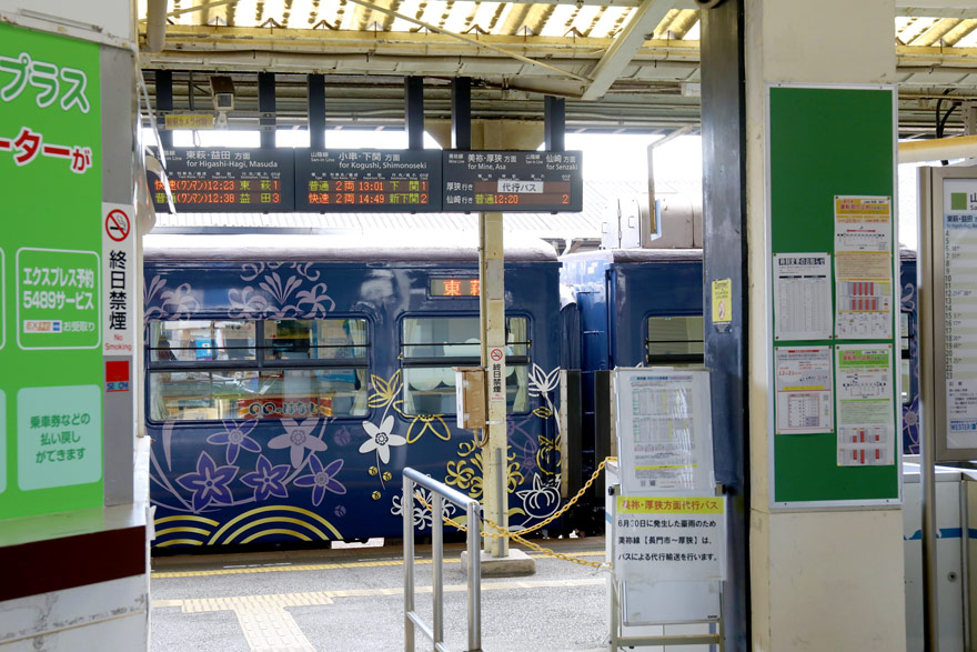 〔 山陰本線 長門市駅 駅舎内 改札口から見える! 観光列車「〇〇のはなし」東萩行き R.7. 11. 24 撮影 〕