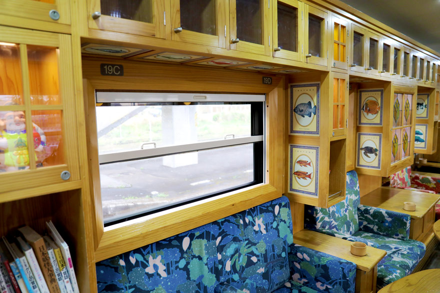 〔「指宿のたまて箱」2号車 本棚には絵本や海にまつわる本などがあり閲覧自由です! R.5. 4. 5 撮影 〕