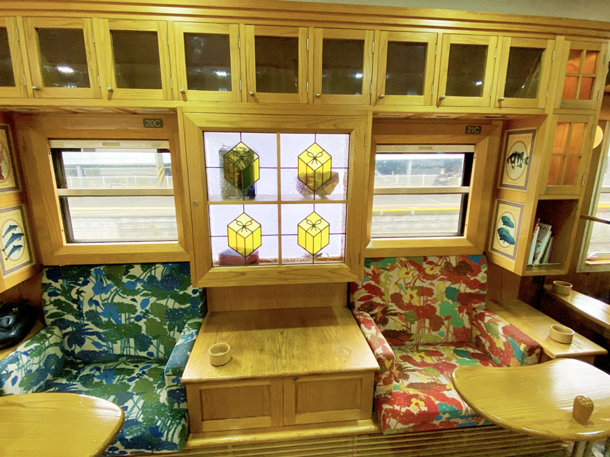 〔「指宿のたまて箱」 カラフルなソファ席には ”たまて箱” がデザインされたステンドグラスや本棚! R5. 4. 5撮影 〕