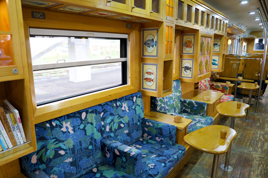 〔「指宿のたまて箱」 カラフルなソファ席には、竜宮でタイやヒラメが踊っているかのようなイラストが満載! 〕