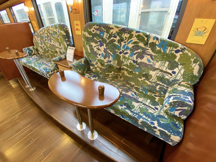 〔「指宿のたまて箱」(予備車) 車内中央に海向きのカウンターテーブルとソファー席を備えている。  R5. 4. 5撮影 〕