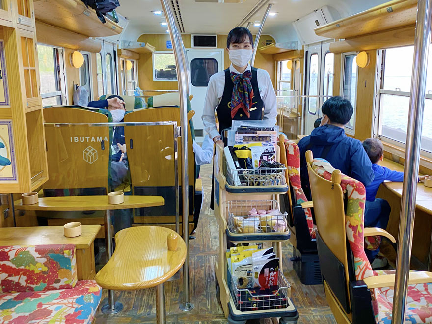 〔「指宿のたまて箱」 客室乗務員による(ワゴンサービス) 車内販売でお菓子やお土産を販売!   R.5. 4. 5 撮影 〕