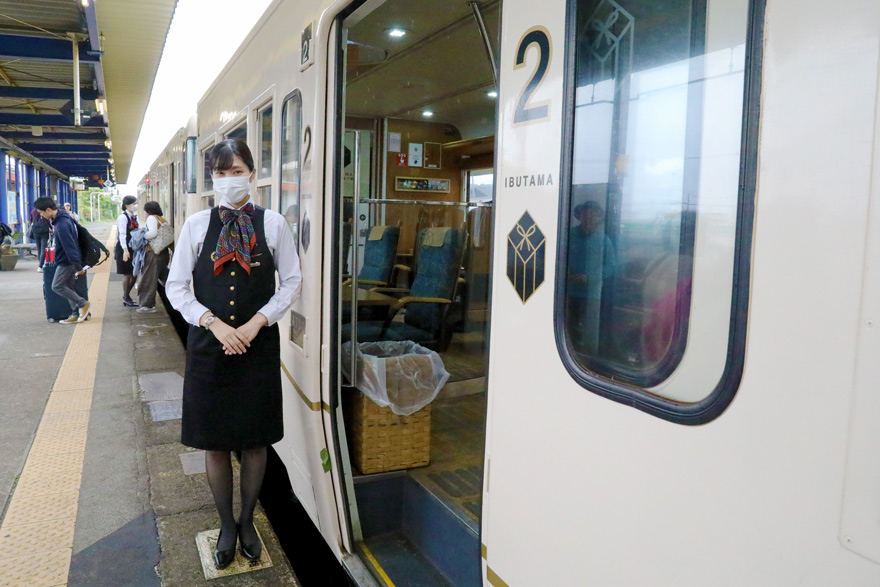 〔「指宿のたまて箱」指宿駅 客室乗務員のお見送りを受け浦島太郎伝説の楽しかった旅がおわります! R5. 4. 5撮影 〕