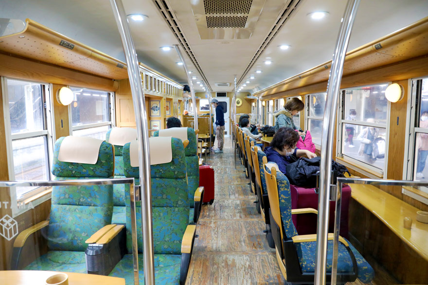〔「指宿のたまて箱」車内は2人掛けリクライニングシート、4人用コンパートメント席、ソフ ァー席、海側の1人掛け席!〕