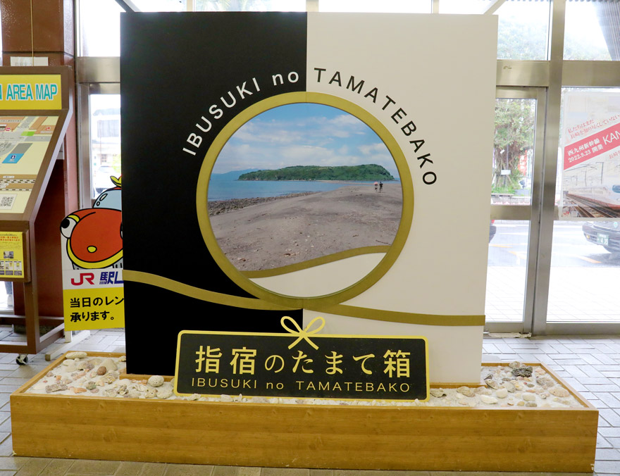 〔 指宿枕崎線 指宿駅 駅舎内には指宿のたまて箱の ” 顔はめパネル ” も置かれている! R.5. 4. 5 撮影 〕