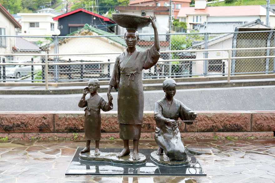 〔 指宿枕崎線 枕崎駅 「かつお節行商の像」台風で遺された女性や子供が、かつお節の製造、販売で遺族を救済の歴史! 〕
