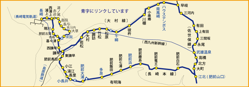 午後便は長崎駅から大村線・佐世保線経由で武雄温泉駅へと向かいます。2つのルートで西九州エリ