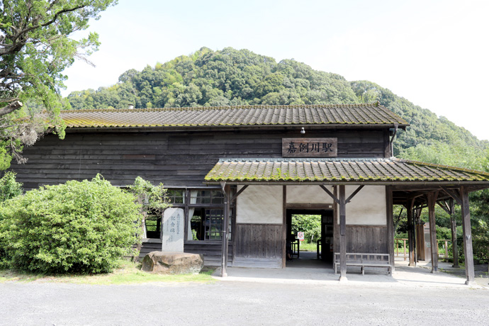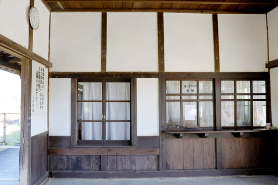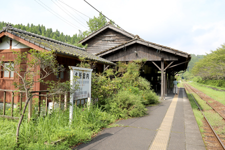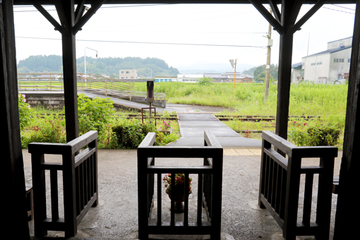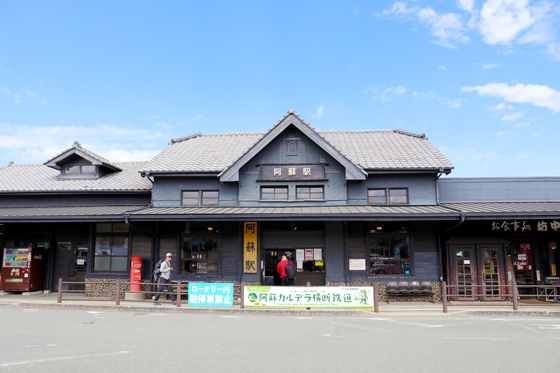ホームから見た黒色で統一した重厚な阿蘇駅の