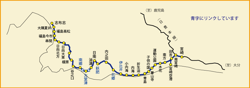 南宮崎駅~志布志駅を結ぶ全長89kmの28駅で昭和38年5月8日に全線開通した。