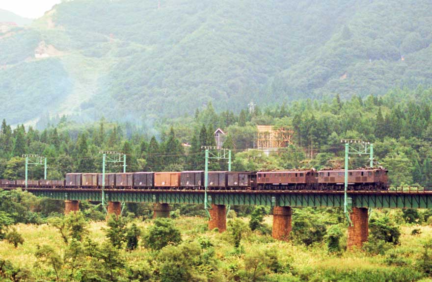 〔 上越線 越後中里上手にて 魚野川鉄橋を渡る”EF16+EF15” S55.9.18 撮影 〕
