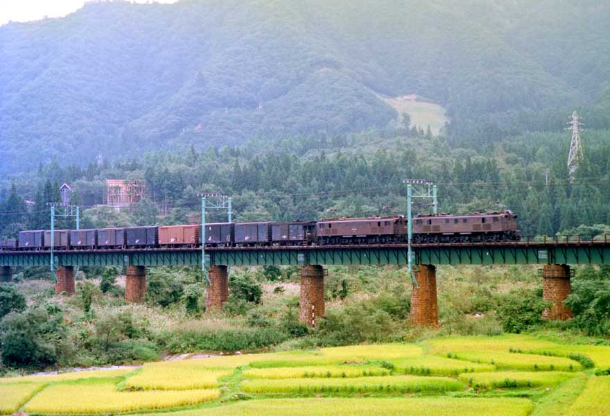 〔 上越線 越後中里上手にて 魚野川鉄橋を渡る ”EF16+EF15” S.55.9.18 撮影 〕