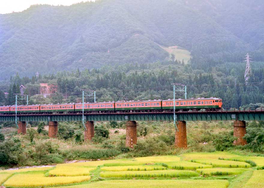 〔 上越線 越後中里上手にて 魚野川鉄橋を渡る ”115系普通列車” S55.9.18 撮影 〕
