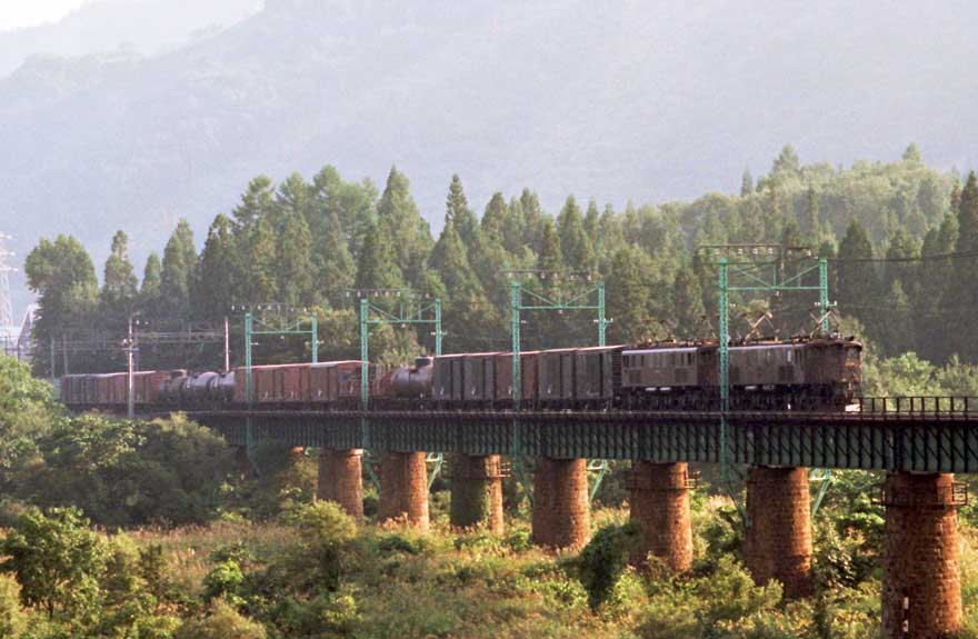〔 上越線 越後中里上手にて 魚野川鉄橋を渡る ”EF16+EF15” S55.9.18 撮影 〕