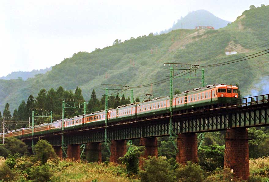 〔 上越線 越後中里上手にて 魚野川鉄橋を渡る 急行165系 ”よねやま” S55.9.18 撮影 〕