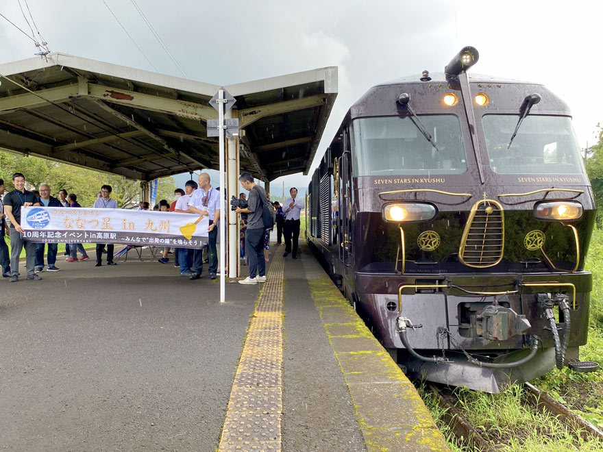 〔 ななつ星in九州 高原駅 ” 10周年記念イベントin高原駅 ” 看板を掲げてのお見送り! R. 5. 8. 24 撮影 〕