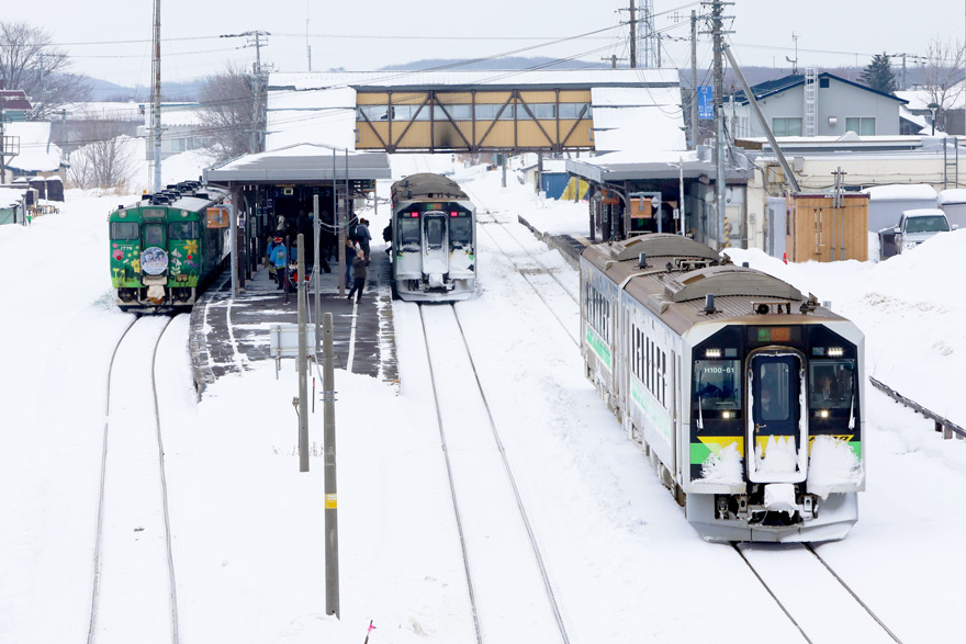 〔 釧網本線 知床斜里駅 「しれとこ摩周号」網走行きの到着を待って釧路行きが発車! (釧路寄り跨線橋で撮影)〕