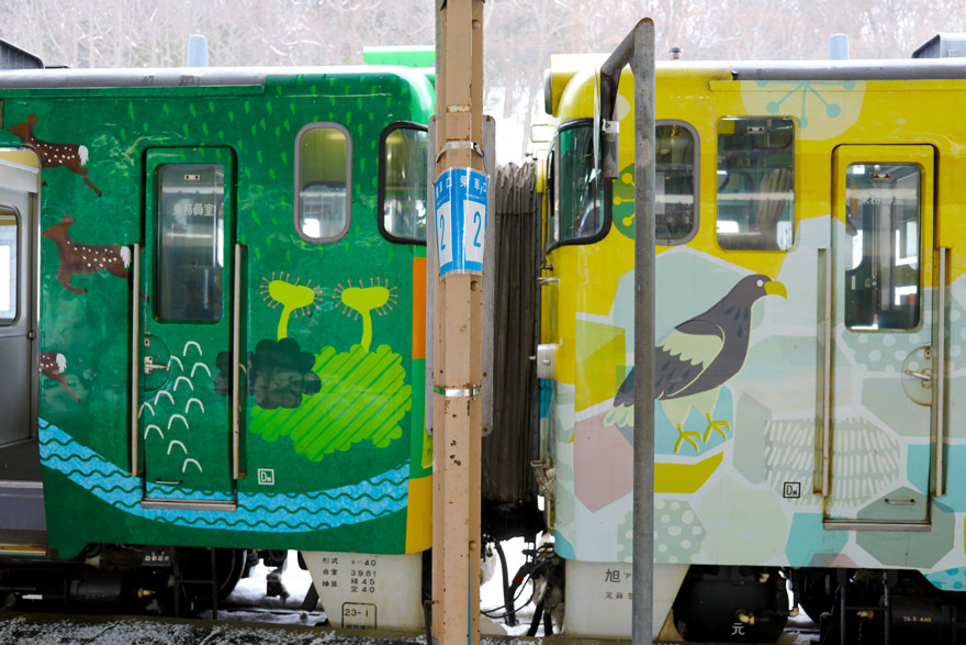 〔 流氷物語号 2号車「道東 森の恵み」・ 1号車「道北 流氷の恵み」 連結付近! R. 7. 2. 13 撮影 〕