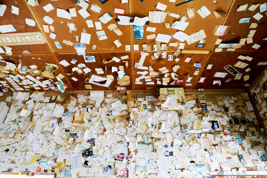 〔 釧網本線 北浜駅 木造駅舎の待合室の壁に訪問の足あととして名刺やきっぷを貼りつけ! 天井にも! 〕