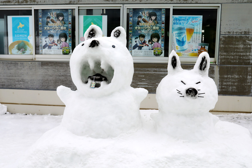〔 釧網本線 浜小清水駅 動物の雪ダルマの口の中にはお守りが! R. 7. 2. 13 撮影 〕