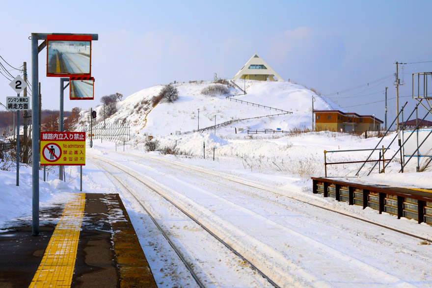 〔 釧網本線 浜小清水駅 後方にフレトイ展望台が見えます! R. 7. 2. 13 撮影 〕