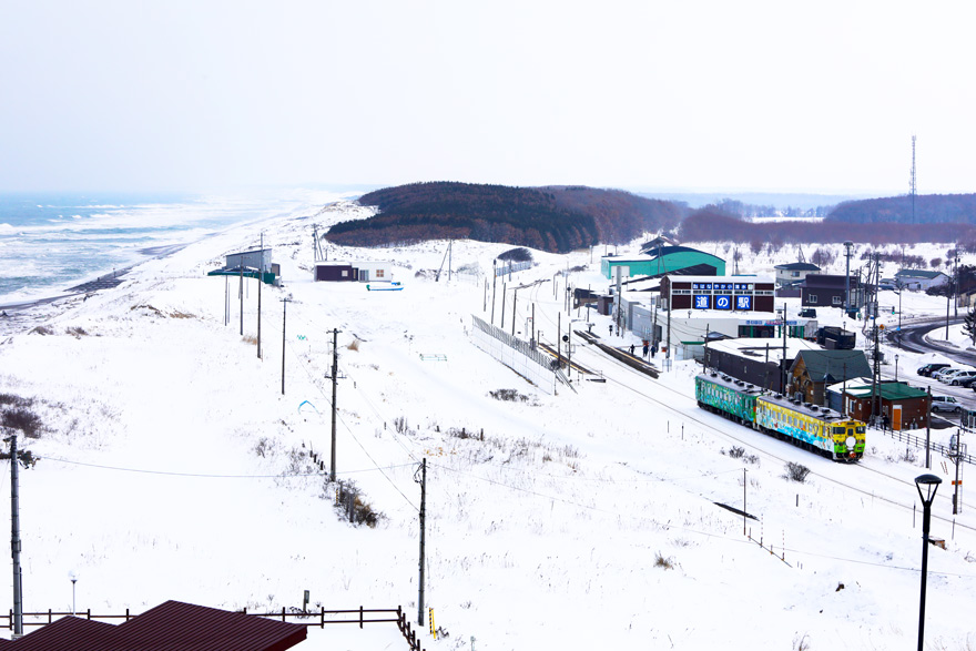 〔 釧網本線 浜小清水駅を発車する! 「流氷物語号」網走行き (フレトイ展望台から撮影) R. 7. 2. 13 撮影 〕